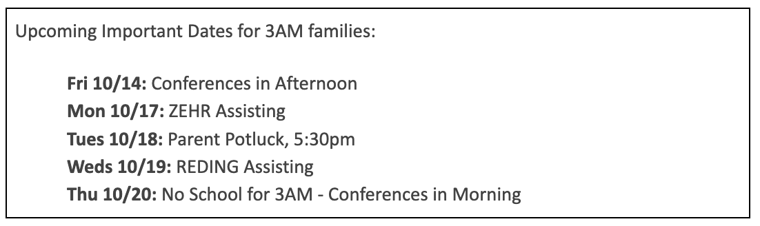 P.S. Thank you everyone for remembering not to leave your strollers in the courtyard at drop-off this week. Our class will not be using the courtyard yet, so there is no need to bundle children up for outdoor play. When we do use that space with children, we will give you advance warning.