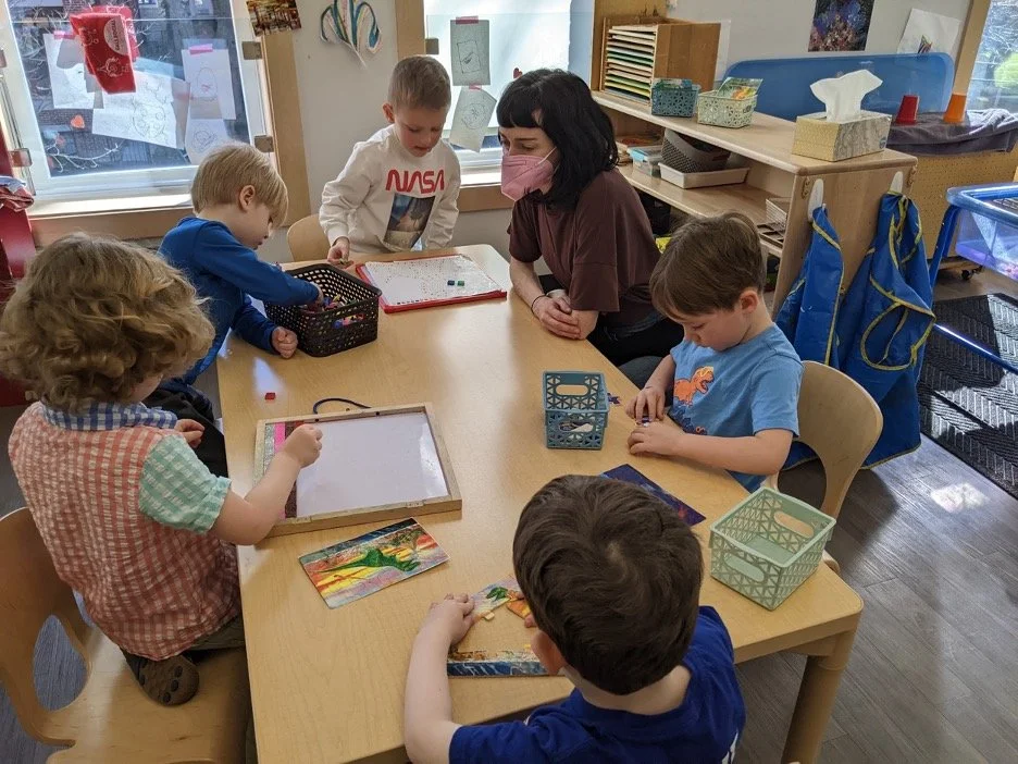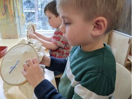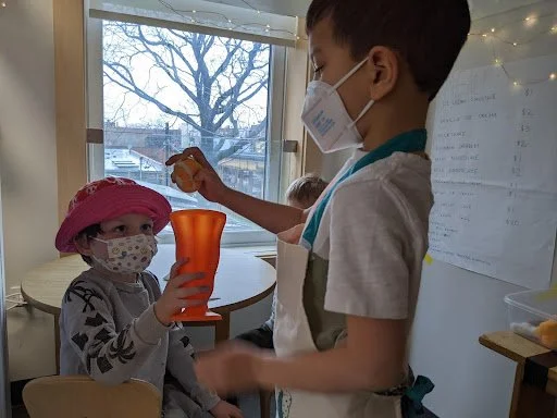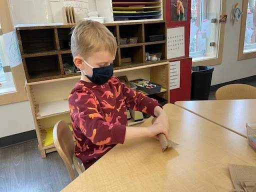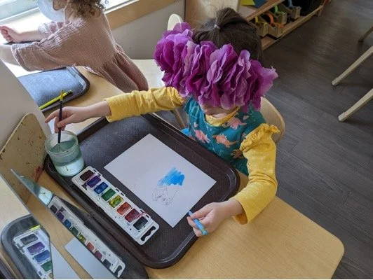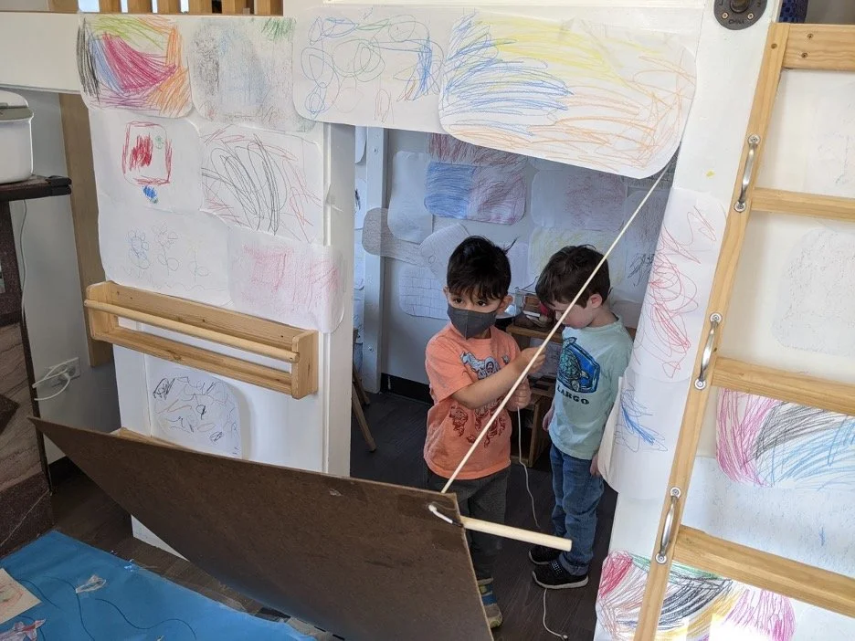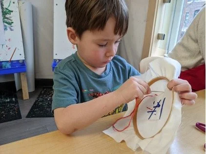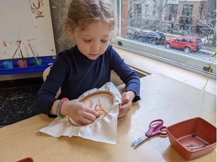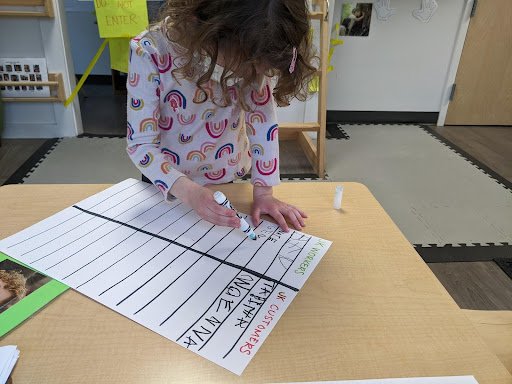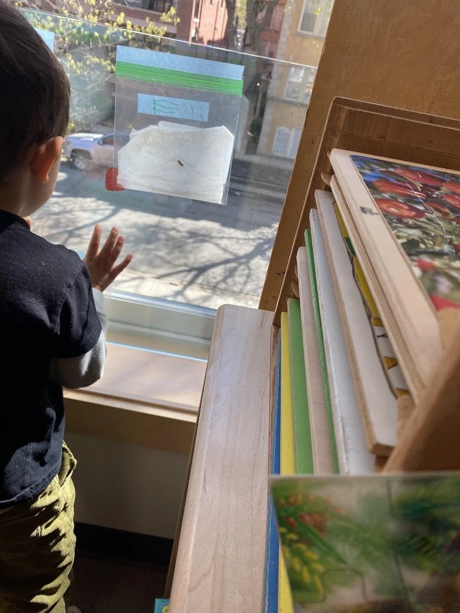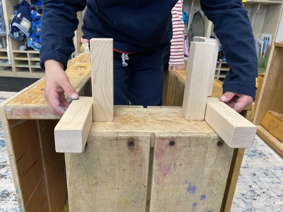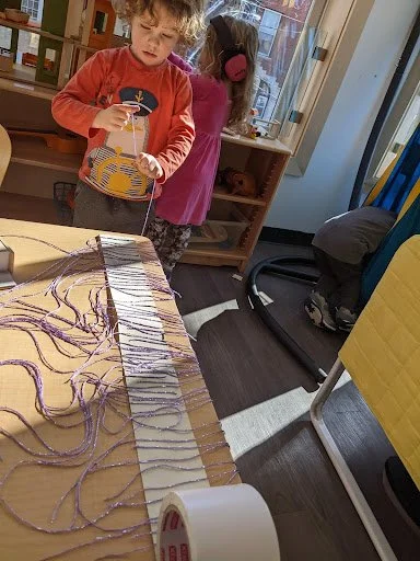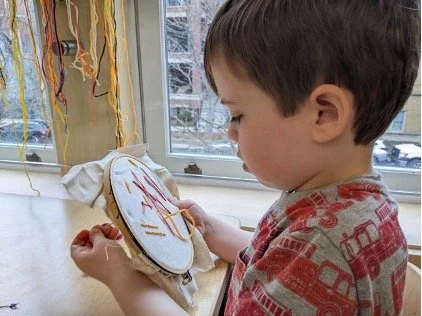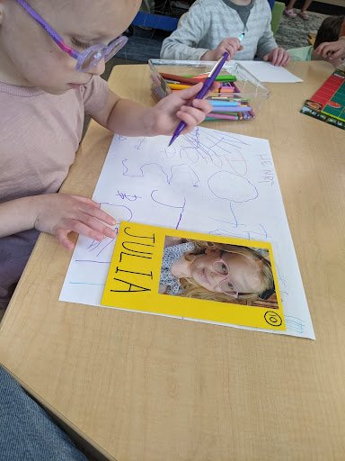 When there are days that you decide to accompany a reluctant child into the room, don't be surprised if they initially regard us with wary or even hostile looks, we may be perceived as interlopers at that moment. Just continue and take them through the motions of hanging up their coat. You can point out their picture on the name card and their cubby, both designations of their own space. This can create a concrete transitional moment from home to school.