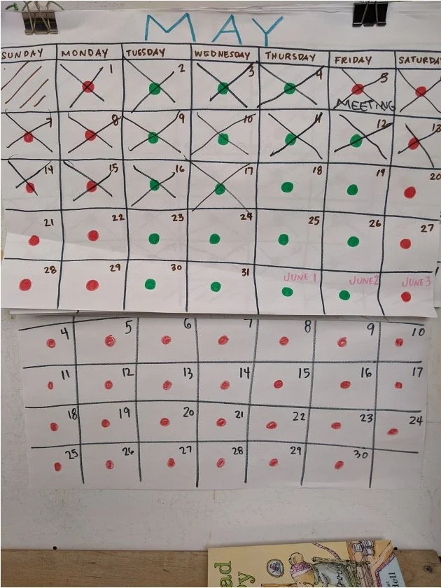 So you might think, here we go back to scratch and the beginning of the year. We need to start separation again. Not really. Remember when we described separation as a lifelong process? Well here is an example of a mini episode in that process. In the fall your kids knew nothing about the space, the adults, the kids, the routine of the day, the expectations. That is no longer the case at all. Now they have laid the groundwork for constructing the experience. On varying levels they now move independently in that space, trust and engage with the adults, play, negotiate and disagree with the other kids, remind each other of the routine of the day, and anticipate the expectations. And we encourage you over the break, to reinforce and converse with kids about the school experience, the people, the activities and the times of day. Reassure them that school will be starting again soon and that it will be the same. For some, a condensed calendar format for the countdown until school starts can prove useful.