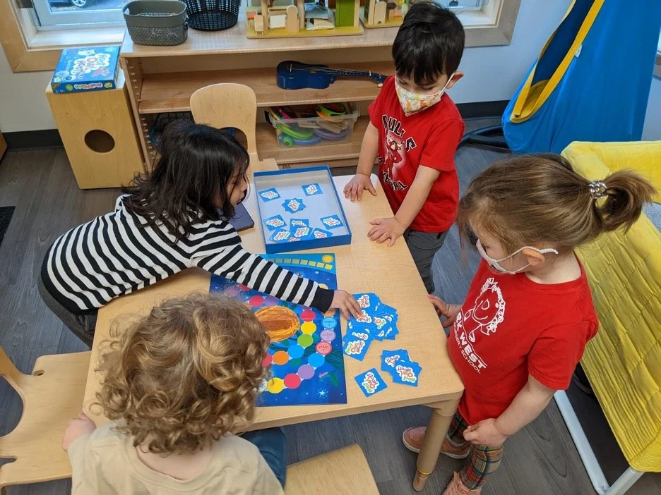During the group time demo, Amanda opened up the board and started taking out the pieces one by one. The board has a large nest in the middle with a path of colored circles spiraling around, ultimately leading to the nest. The pieces of the game include 3 owl disks and one small sunshine card. There is also a deck of cards with colored circles on them and mixed into this deck are larger sunshine cards. Amanda let everyone know that even though there were three owl disks, that there could be 1,2,3 or 4 players and more importantly, that no one gets to actually BE one of the owls. Instead, the kids playing are really helping all of the owls get home before sunrise. Participants are to take turns choosing a card from the deck. If it’s a color, then they can move one of the owls to the next colored circle on the board. But, if they choose a sun, then the little sun card gets moved closer towards day time. It’s a lot to process for these kids. The teachers then “play acted” together with kids watching, sometimes trying to take two turns rather than letting the other person have their turn in order to demonstrate how to manage these types of disagreements. For example after Kristin’s turn, she tried to take another card right away. Amanda chimed in with, “Kristin, I think I get to go now.” Then Kristin said, “But I want to have another turn right away.” And as if on cue, kids chimed in with, “It’s not your turn Kristin. Don’t worry, you will have a turn again after Amanda.” This play acting acknowledges how children are subverting their own wishes to keep the game going, and emphasizes the structure of turn-taking.