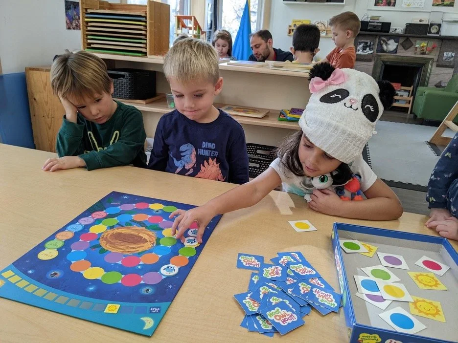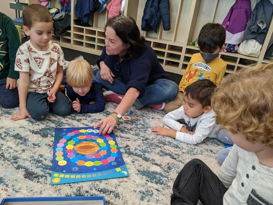 This week we introduced this new board game in the 4am class. And while we have had other board games on our shelves since the beginning of the year (Snail Race, Teddy Bear Bingo, Garden Matching Game) we felt that kids were ready for this next step, demoing a board game during our group time. Most of the games we have in our room are cooperative games. We choose these games because players work together toward the same goal. There are no individual winners or losers. This is not to say that we are against competitive games, only that cooperative games foster a feeling of community and a shared purpose which can create a climate of inclusion and foster negotiations that feel good to preschoolers. Introducing a brand new game to a group of 18 3 and 4 year olds requires a lot of patience and focus for everyone, teachers and children alike. It requires kids to stay on the edge of the rug, so that everyone can see. This is so much harder than it sounds! It requires children to listen to the procedures and rules of the games and to not touch the board or pieces. However, the novelty of this new game and the drama around, “Will the owls make it back to the nest before sunrise?!” had everyone so invested and enthralled, that our community of 4AMers were able to sit back, watch, ask questions, make observations and take it all in.