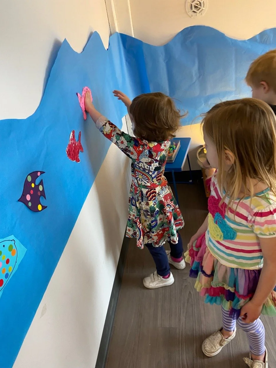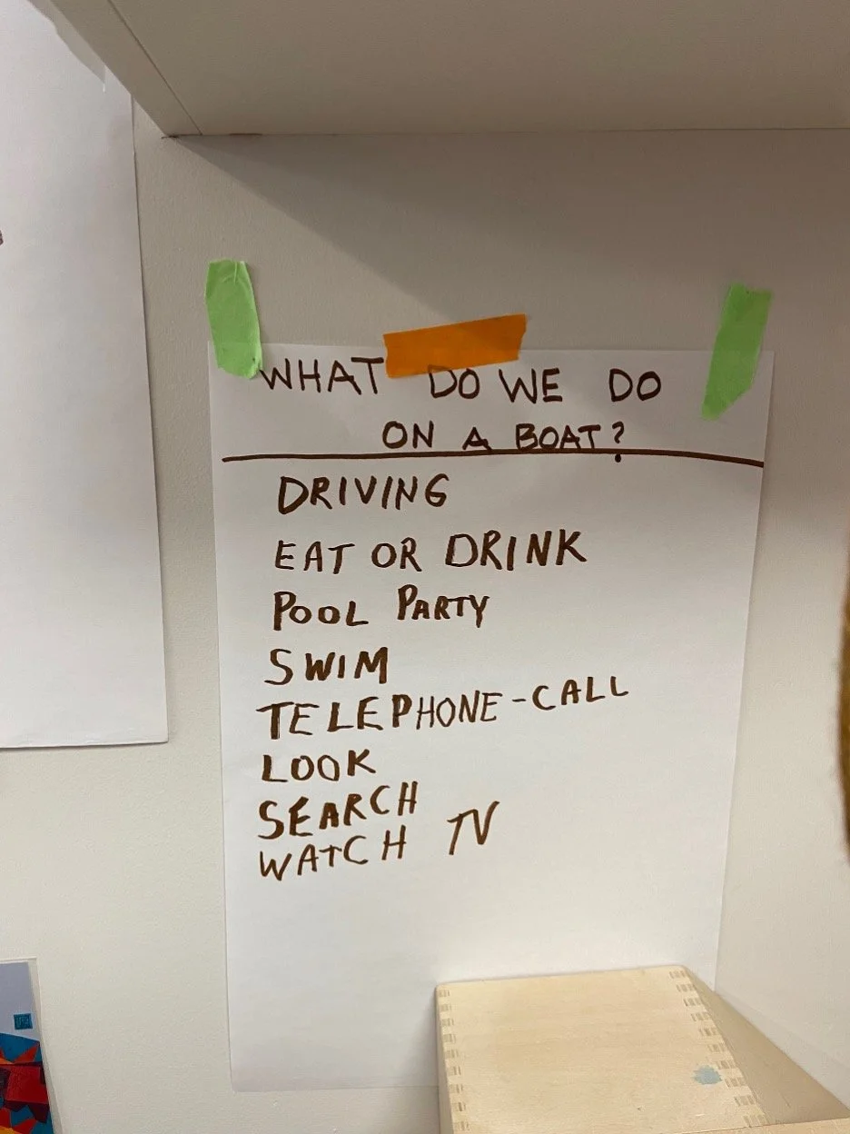 The calendar pages for the previous months are available for kids to look over, and many will point to Parents Day or a day we played outside and talk about what they remember. We’ve read books about summer activities and books about staying in touch with someone far away. We’ve had kids help us wash toys in the water table, so they can be put away for the summer. We told kids last week that we’d be finishing with our playhouse boat, and this week we’ve had a simpler setup.