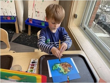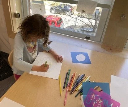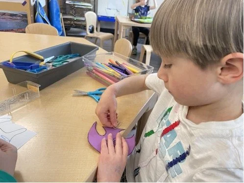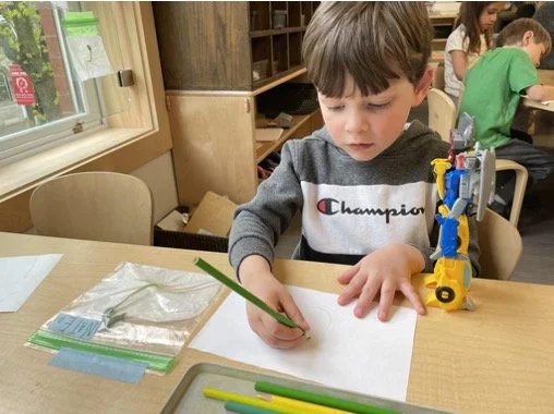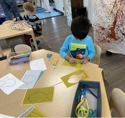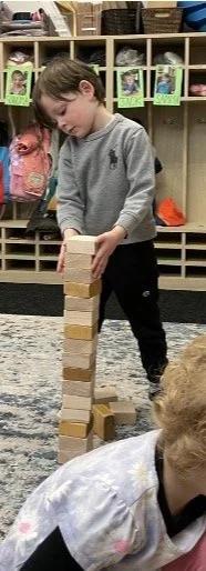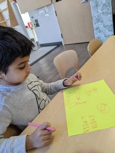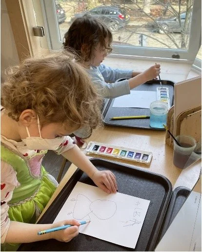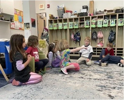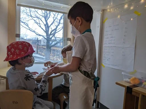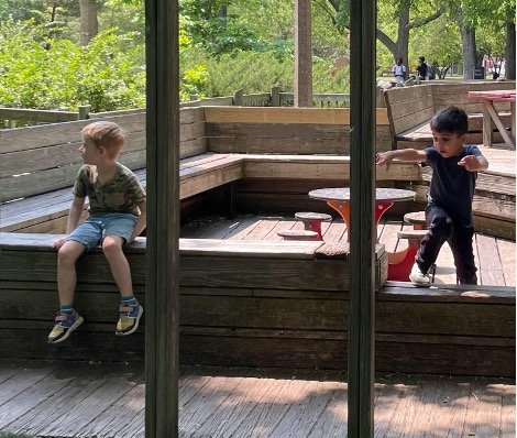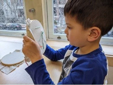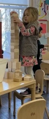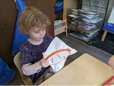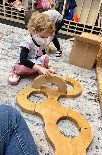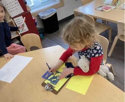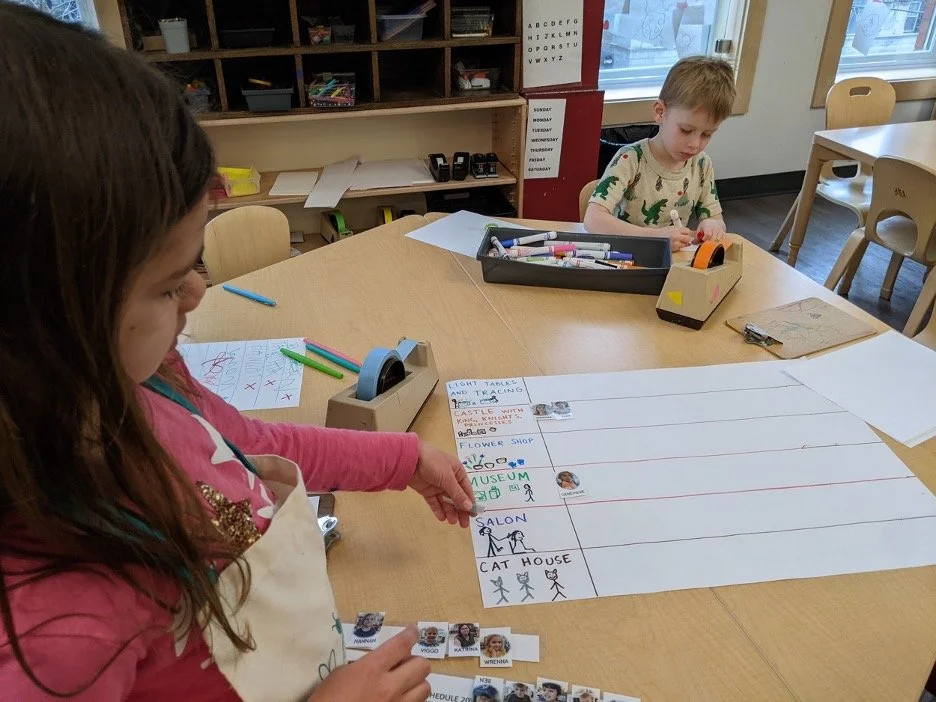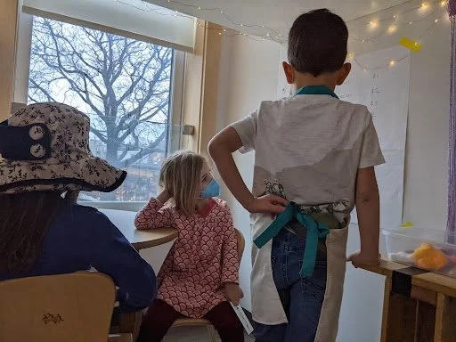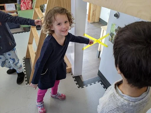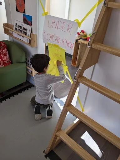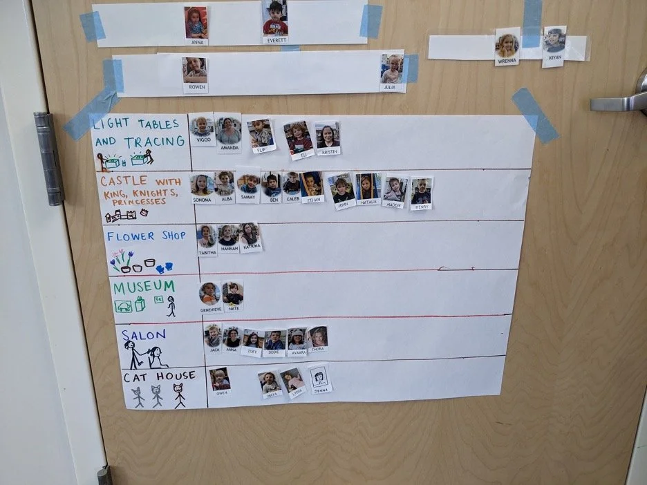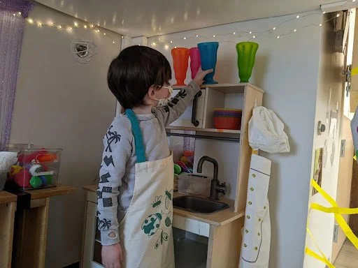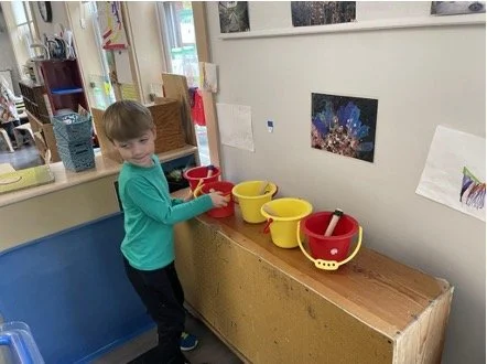 When there are days that you decide to accompany a reluctant child into the room, don't be surprised if they initially regard us with wary or even hostile looks, we may be perceived as interlopers at that moment. Just continue and take them through the motions of hanging up their coat. You can point out their picture on the name card and their cubby, both designations of their own space. This can create a concrete transitional moment from home to school.